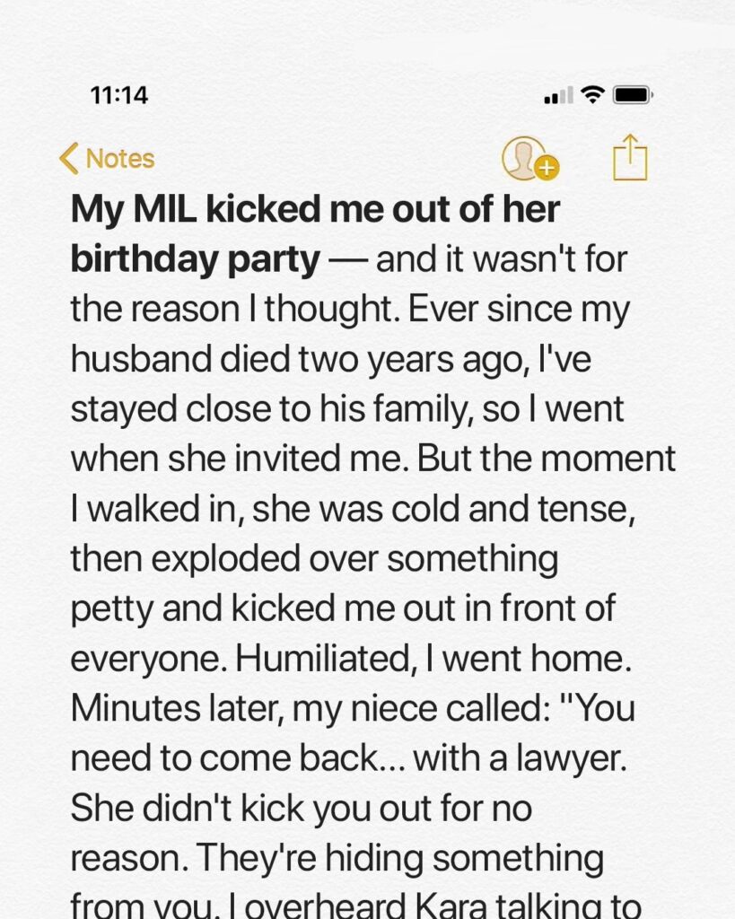 I dressed for a birthday, not a battle—Luca’s cardigan, his favorite lemon cake. Two years after his death, I still showed up for his family. But the moment I stepped into Noreen’s house, the air shifted. Cold stares, clipped words, and finally: “You need to go. You’re not family. Not anymore.” Humiliated, I left—until my niece called. She’d overheard Kara and Uncle Brent plotting to sell Luca’s 12 acres, using Noreen to “sign on his behalf.” Luca was gone; ghosts don’t sign deeds. She sent me a recording.